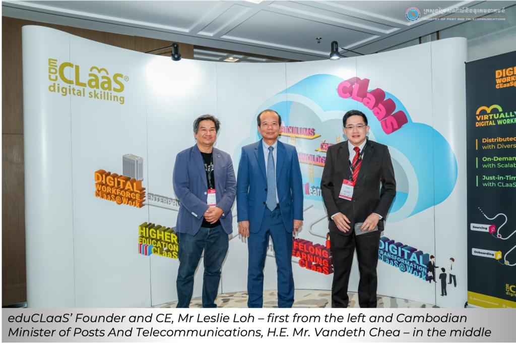 Mr. Loh further illustrated how eduCLaaS plan to collaborate with higher education institutions in Cambodia for dual-track lifelong applied learning delivery to support youth in digital career induction, under-employed adults conversion to in-demand digital jobs, and workforce digital upskilling for SMEs digital transformation. Collectively, as a Digital Skills Coalition, it delivers interdisciplinary curriculums, work-integrated learning, interoperable credentials, blended learning technologies, employer ecosystem, and income-sharing schemes to deliver inclusive digital skilling for all.