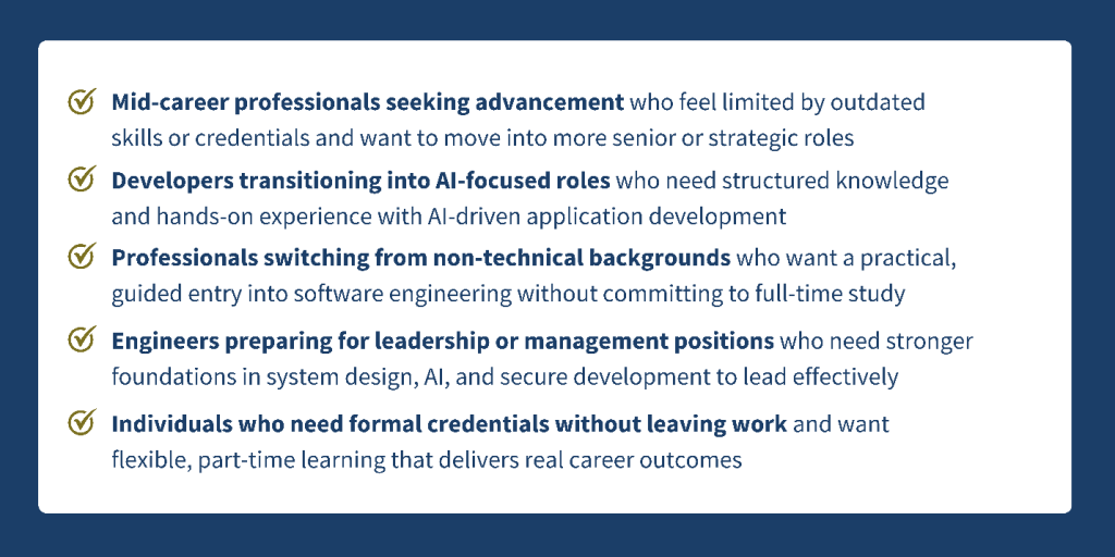 - Outcome: Graduates prepared for advanced specialist or technical leadership roles, equipped with a recognised master’s degree and real-world project experience.