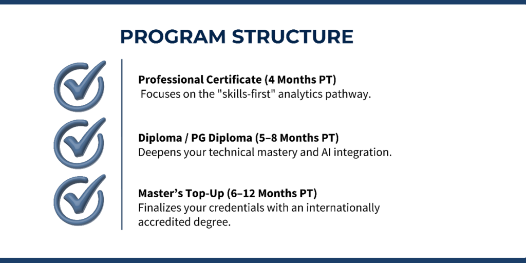 - Outcome: Develop practical data and AI skills that prepare you for entry to mid-level roles such as Data Analyst, AI Workflow Specialist, or Analytics Consultant.