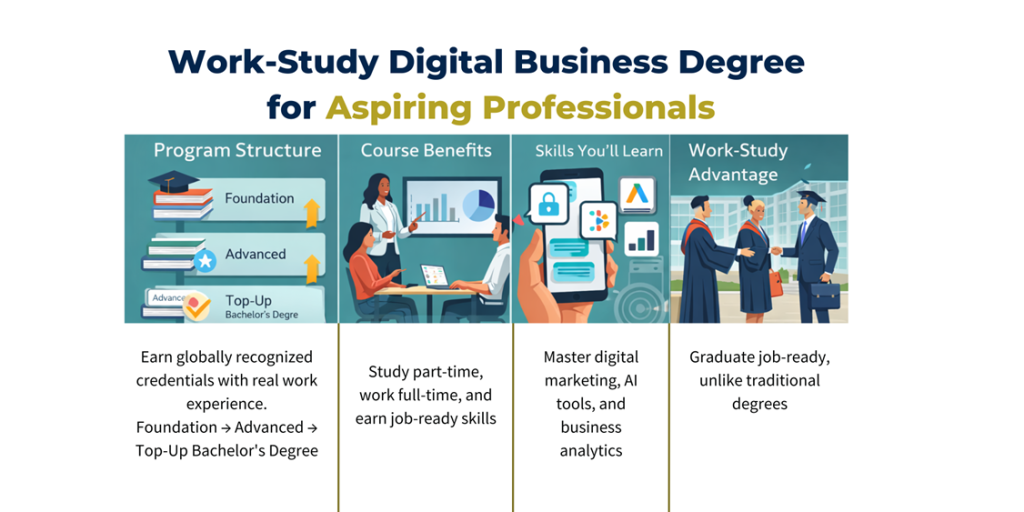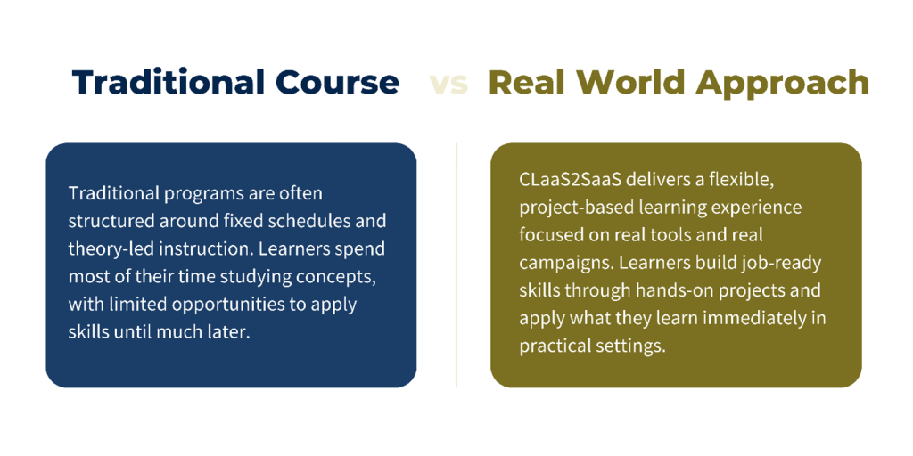 If you’re ready to move beyond theory-heavy education, explore how the CLaaS2SaaS Work-Study pathway can help you gain practical digital marketing skills, hands-on experience with AI tools, recognised certifications, and a bachelor’s degree, all in one structured journey.