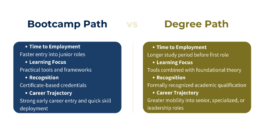 Employers value practical skills, tool experience, and real project outcomes, which fast-track programs deliver.
