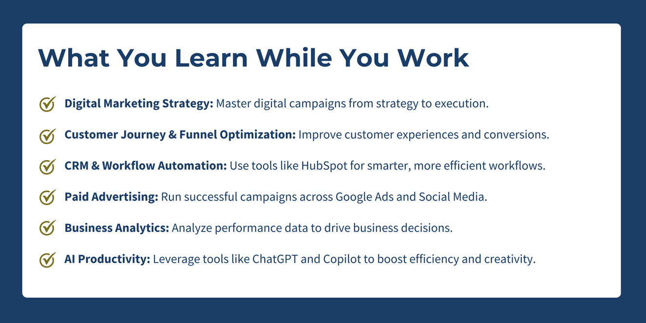 - Training in widely used tools (Google Ads, HubSpot CRM, SEO platforms)