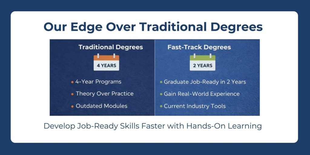 No. Fast-track programs remove inefficiencies and focus on job-relevant skills instead of outdated content.