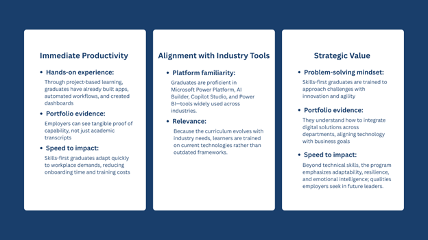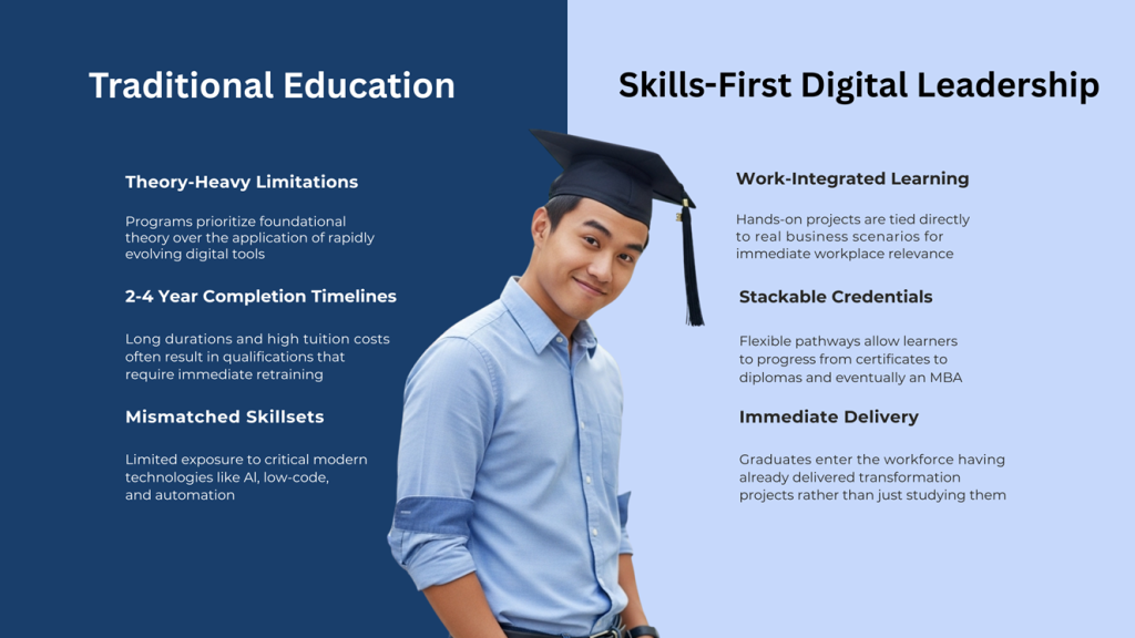 This “skills gap” means that many learners complete traditional coursework but still struggle to meet workplace expectations — particularly in areas like: