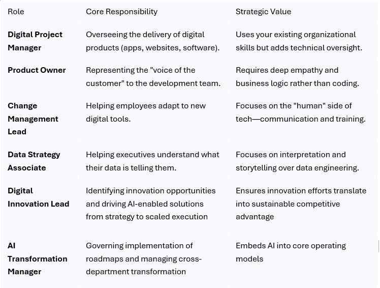 Once you complete a digital transformation course no tech background required, a whole new tier of the job market opens up to you. These roles often sit at the intersection of leadership and technology.