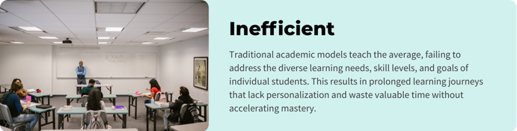 Traditional academic models teach the average, failing to address the diverse learning needs, skill levels, and goals of individual students. This results in prolonged learning journeys that lack personalization and waste valuable time without accelerating mastery.