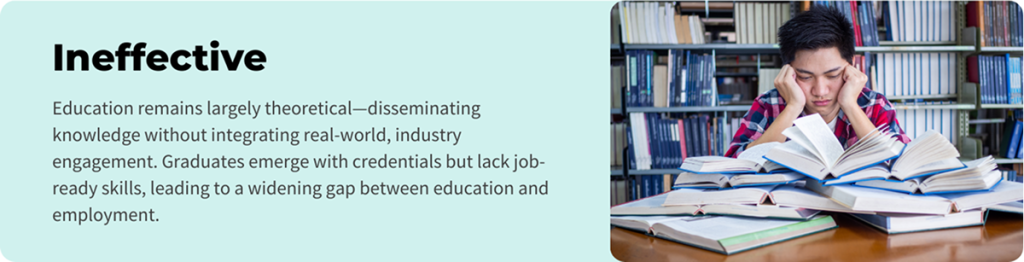 Education remains largely theoretical-disseminating knowledge without integrating real-world, industry engagement. Graduates emerge with credentials but lack job-ready skills, leading to a widening gap between education and employment.