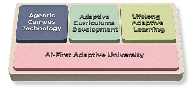 The Lifelong Applied Adaptive University integrates AI-powered learning agents, adaptive curriculum design, and modular credential pathways to deliver personalized, work-integrated education.